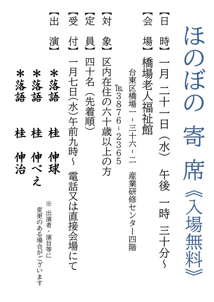 ほのぼの寄席(橋場老人福祉館)開催のお知らせ